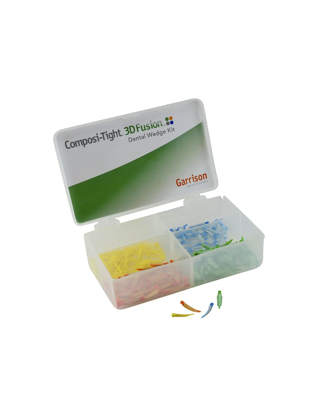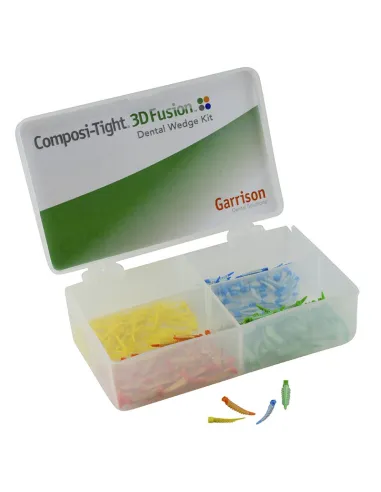 Las cuñas interproximales Composi-Tight 3D Fusion de Garrison se adaptan a cualquier sistema de matrices ya que son ultra adaptables. Estas cuñas de plástico con silicona, combinan a la perfección un firme núcleo interno y características mecánicas avanzadas para crear una adaptabilidad superior, gracias a su cobertura externa Soft-Face™ logra adaptarse a las irregularidades interproximales.