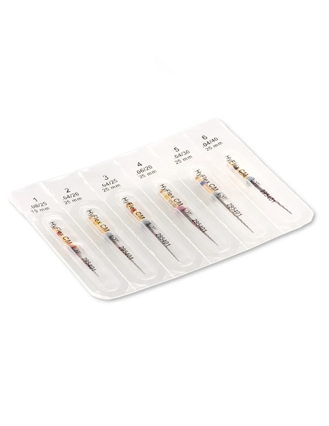 HyFlex CM Niti Secuencia Longitud Única 25mm de Coltène contiene 6 limas: 25 mm 20/.04, 25/.04, 30/.04, 40/.04, 20/.06, 19 mm 25/.08.