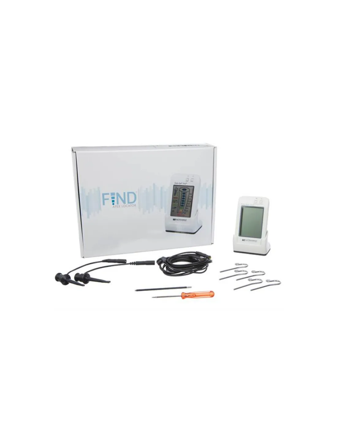El Kit Endo-Eze FIND de Ultradent contiene: 1 unidad FIND, 1 soporte, 1 sonda táctil, 1 cable de medición, 2 clips de lima, 5 clips labiales.