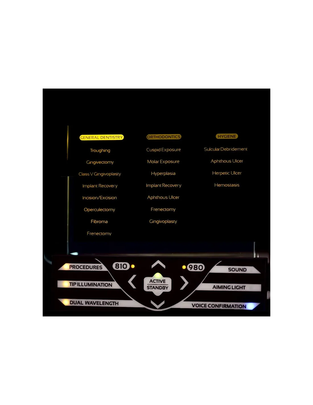 Su innovadora pantalla diseñada con más de un 80% de transparencia e inclinada para facilitar la visión desde cualquier punto, posee una sencilla interfaz con 20 procedimientos preestablecidos en tres categorías: Odontología general, Ortodoncia e Higiene.