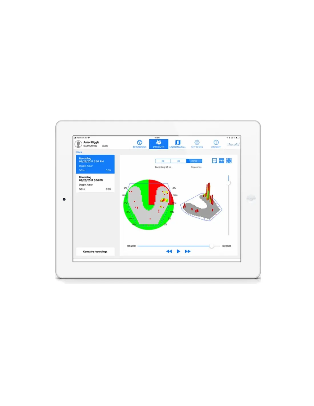 Los datos registrados se almacenan en la ficha del paciente de la aplicación del ipad, pudiendo ser revisados y exportados en cualquier momento.