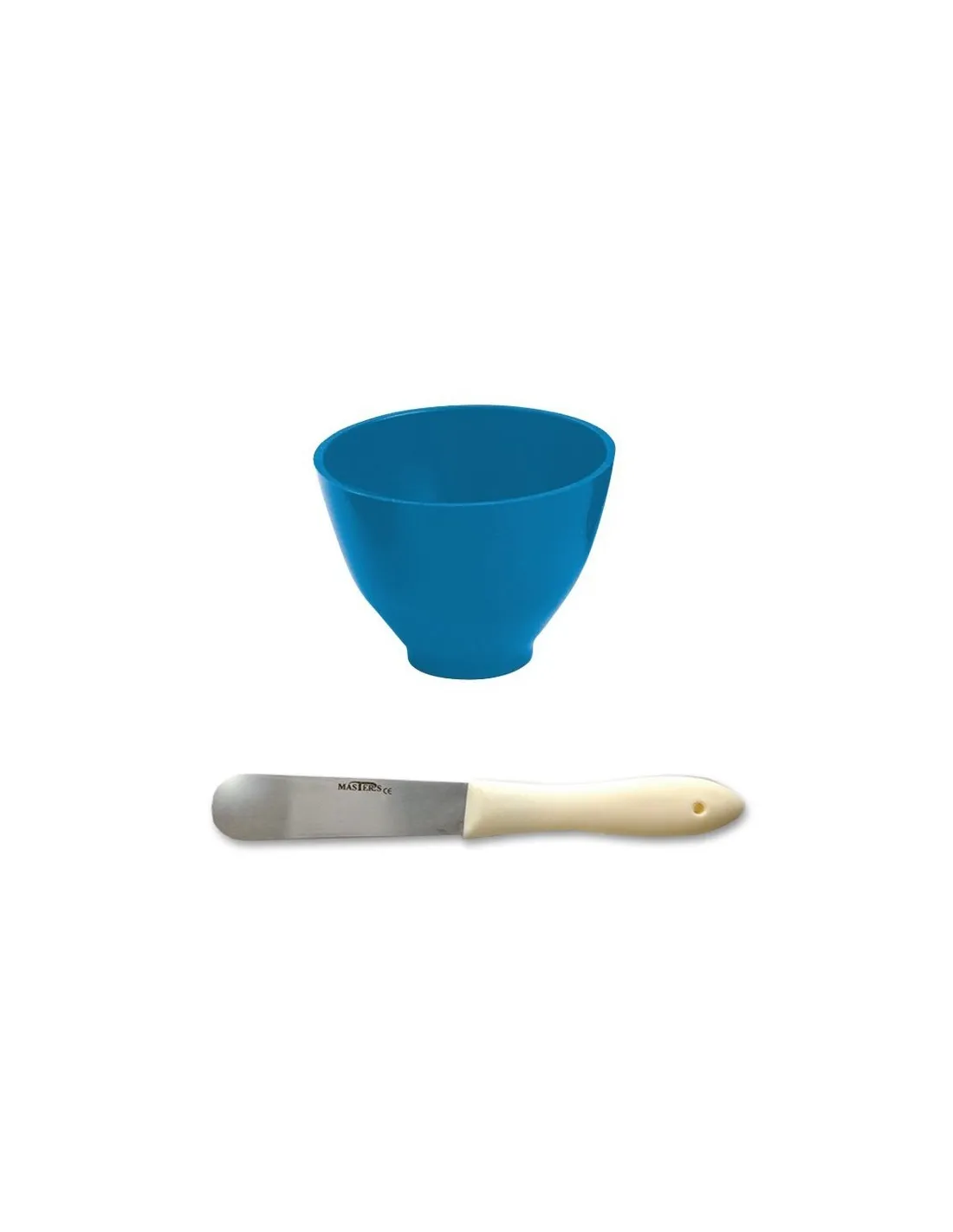 Taza de silicona de Masters, de color azul, semirrígida y flexible. De paredes altas, permite batir el alginato sin riesgo de desbordarse. Útil para batir escayola en caso de necesidad.