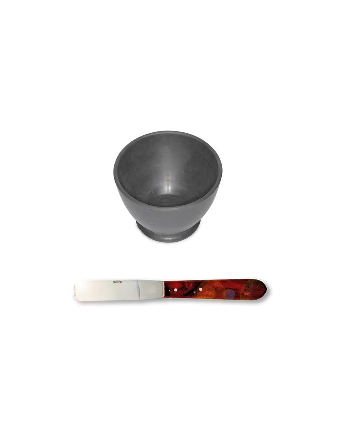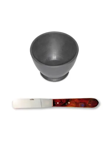 El set para batir escayola está formado por los dos principales accesorios necesarios para mezclar yeso. La taza de goma y la espátula para escayola.
