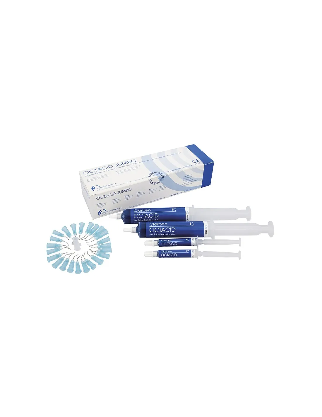 El envase de Octacid Jumbo de Clarben contiene: 2 jeringas de 25 ml + 2 jeringas de 3ml. + 25 cánulas.