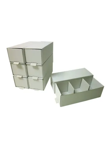Fabricada en cartón blanco de alta resistencia mantiene protegidos de golpes exteriores los modelos de escayola y para evitar que choquen entre ellos y se fracturen dentro de la caja posee separadores de doble cartón. Además, se pueden apilar para ahorrar espacio y así ordenar correctamente.