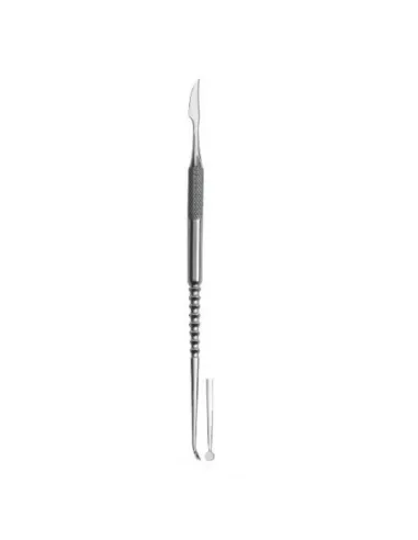Espátula de doble parte activa: una cuchilla recta con una leve angulación y otra con forma de cucharilla plana angulada.