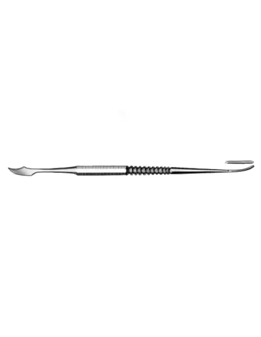 Consta de dos partes activas, una parte con forma de pequeña cuchilla angulada y otra, acabada en una espátula ligeramente curvada.
