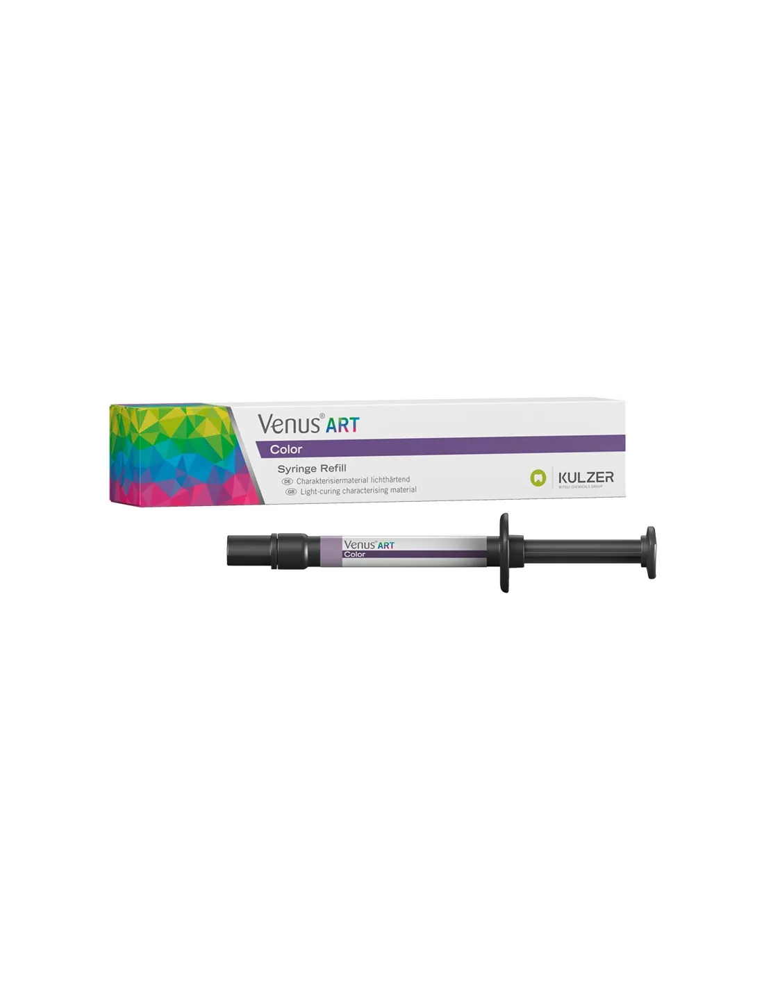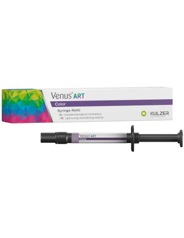 Venus Art Color de Kulzer es un composite de base híbrida de partículas finísimas. Monómeros de metacrilato multifuncionales (UDMA, EBADMA) y contiene aprox. 65%-m o 38%-vol de rellenos orgánicos, como cristal de silicato Ba-Al-F, YbF3, SiO2. El tamaño de partícula de estos rellenos se encuentra entre 0,02 μm y 5 μm.