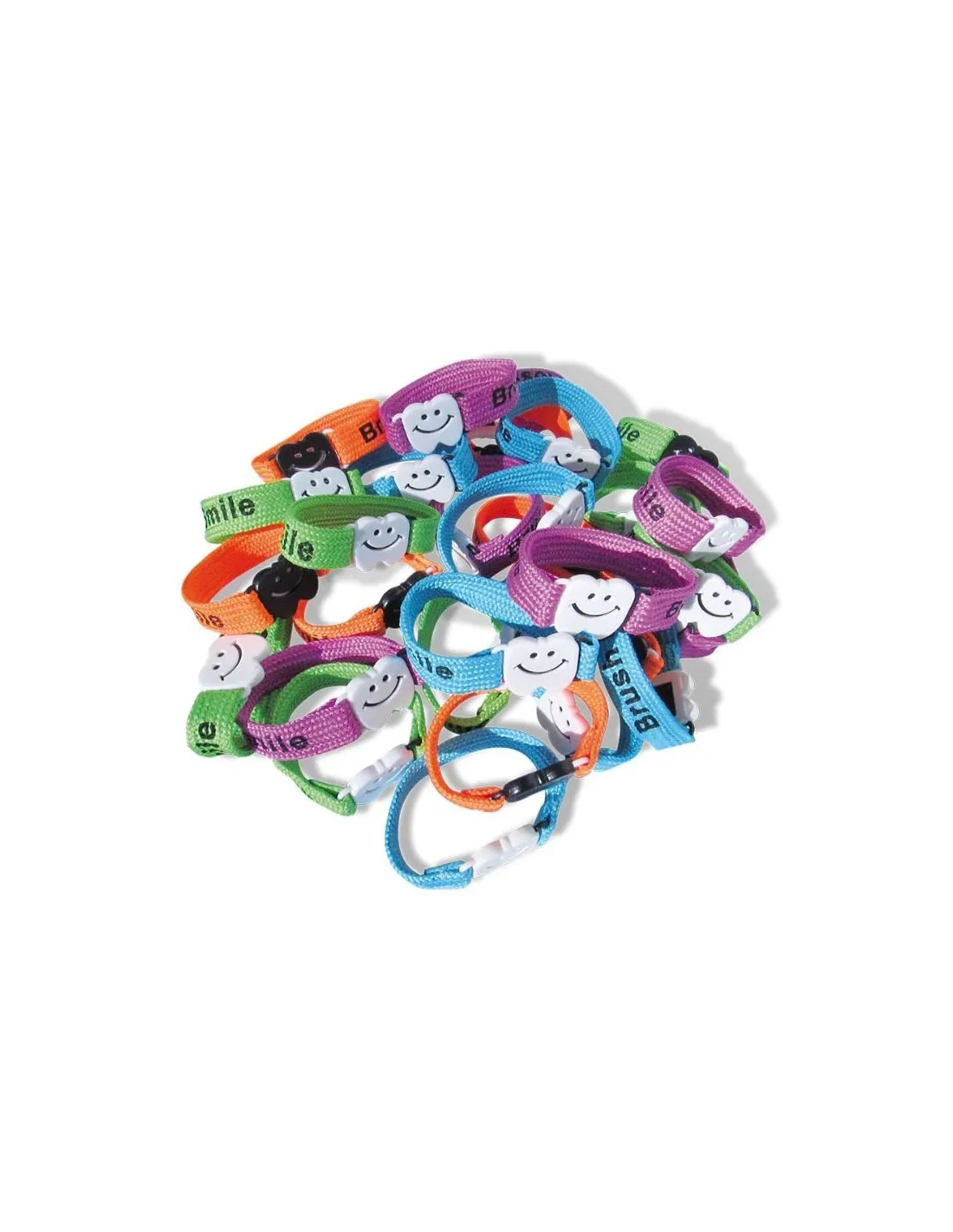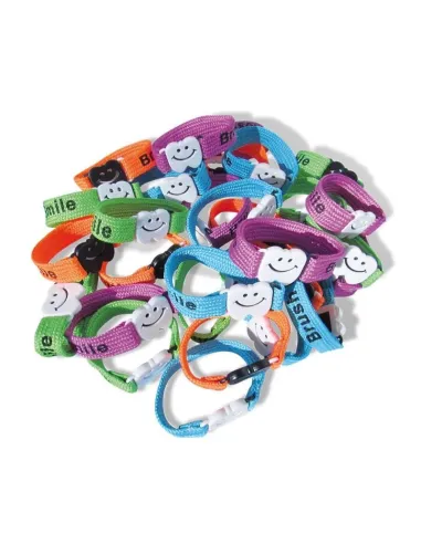 Las pulseras dentales infantiles de Kike Toys son pulseras de colores de tejido trenzado con la palabra sonrie coronada por una muela.