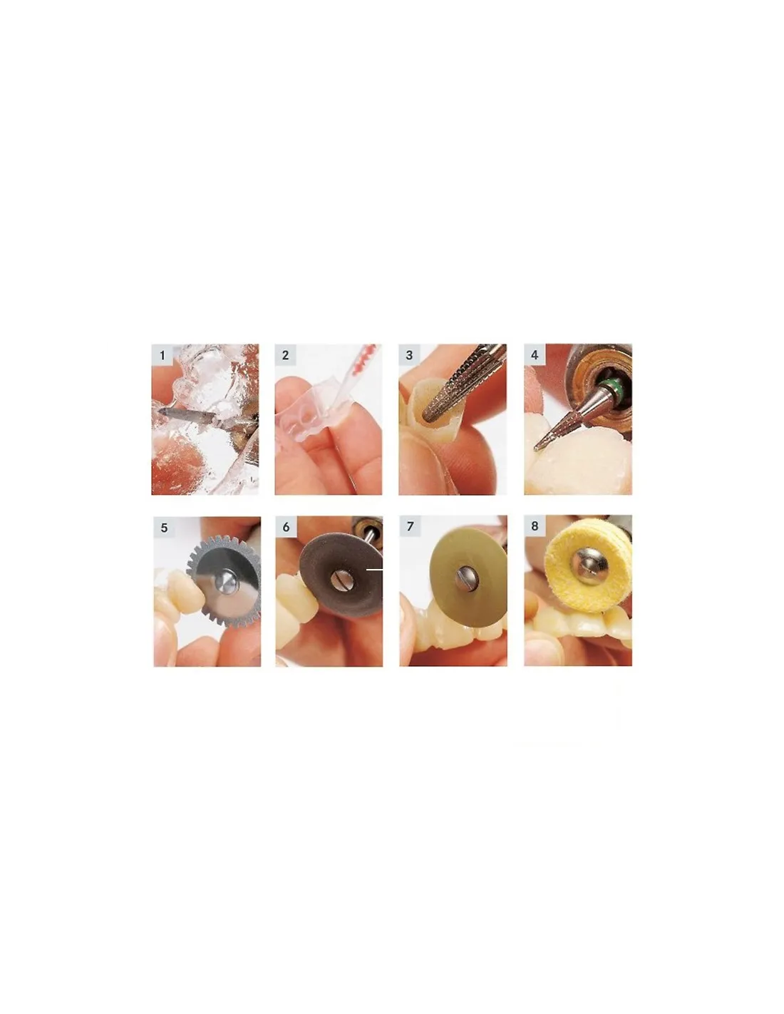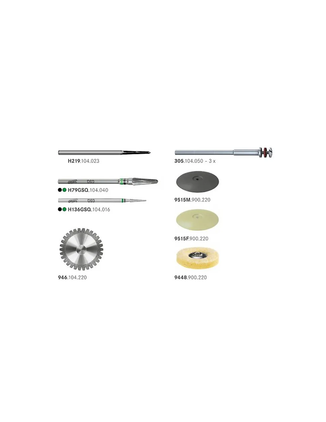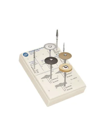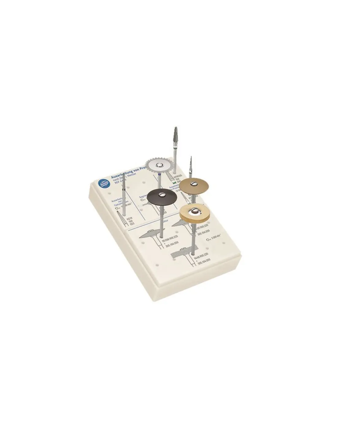 Set para provisorios de Komet, acompañado por un práctico soporte para mantener ordenados los instrumentos gracias a su número y a su dibujo. Además, de tener impresa las indicaciones sobre sus velocidades óptimas.