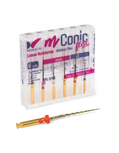 Las limas mConic Flex están fabricadas en una aleación de Níquel-Titanio y sometidas a un especial tratamiento térmico MaxFlex Technology, que las dota de mucha más flexibles y resistentes a la fatiga cíclica. Todo esto permite al profesional realizar con gran seguridad y con el mínimo riesgo de fractura, conformaciones de conductos excepcionales.