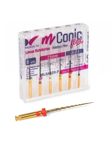 Las limas rotatorias Ni-Ti mConic Flex 25mm se presentan en cajas de 6 limas, conicidad a elegir entre las disponibles o el surtido.
