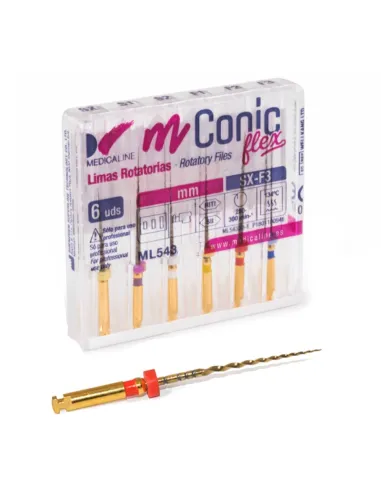 Las limas rotatorias Ni-Ti mConic Flex 31mm se presentan en cajas de 6 limas, conicidad a elegir entre las disponibles o el surtido.