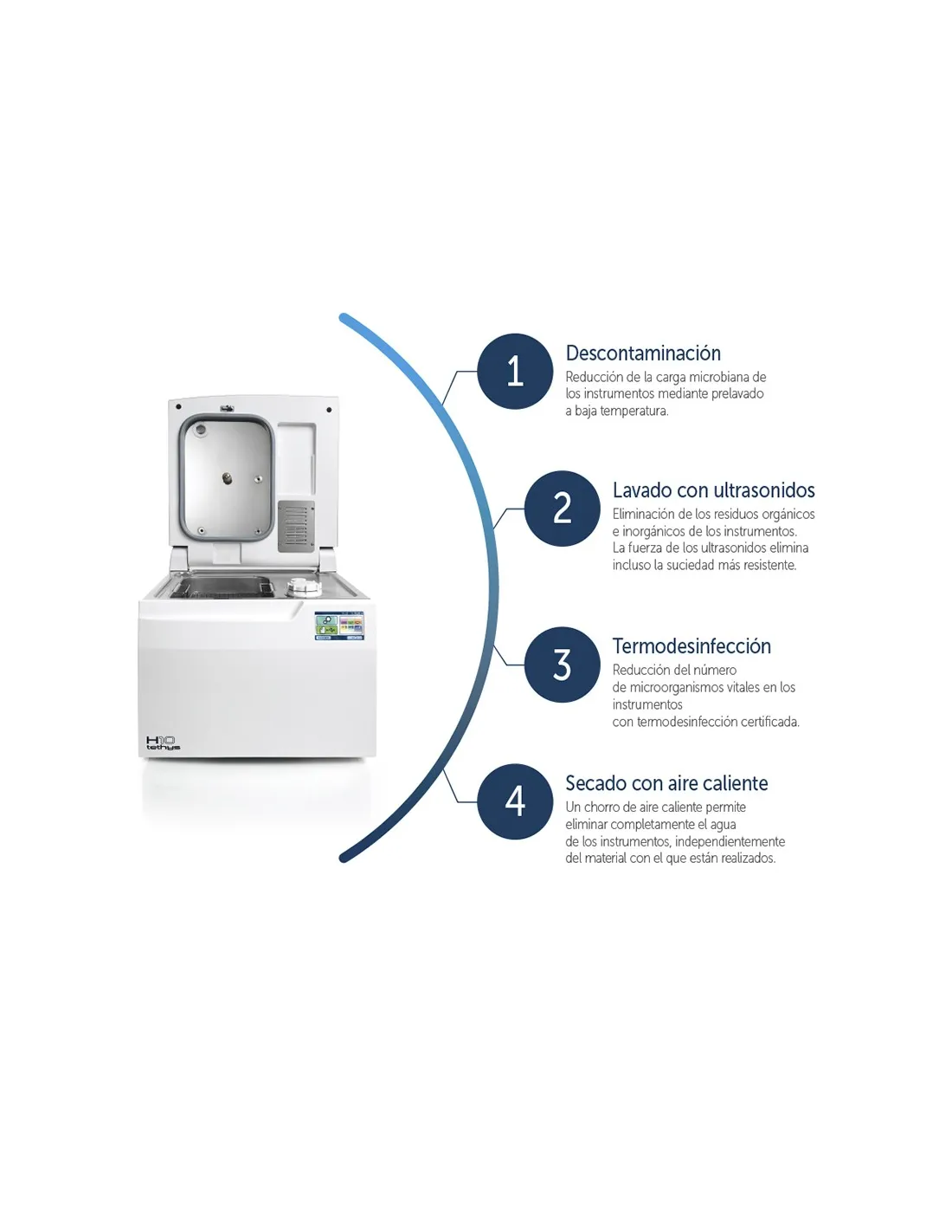 - Descontaminación, lavado con ultrasonidos, termodesinfección y secado con aire caliente en un único ciclo.