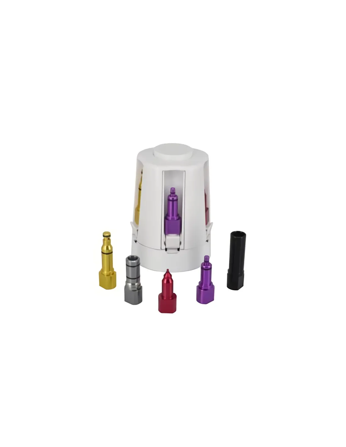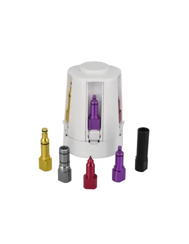 El kit incluye 5 diferentes adaptadores tipo husillo, NSK, de baja velocidad, NSK QD y tipo KAVO.