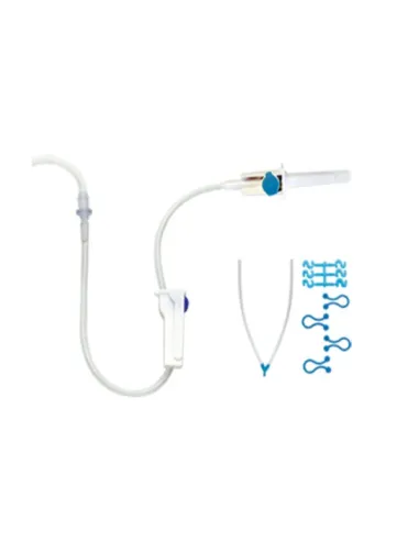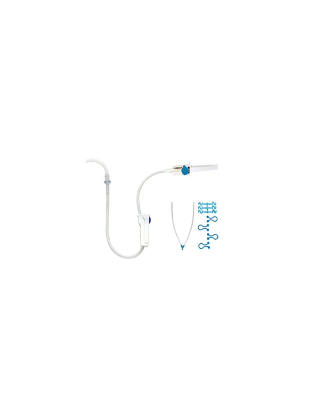 Compuesto además, por perforador, roller o clamp para el control de flujo, tubos y sesión de pompa peristáltica integrada.