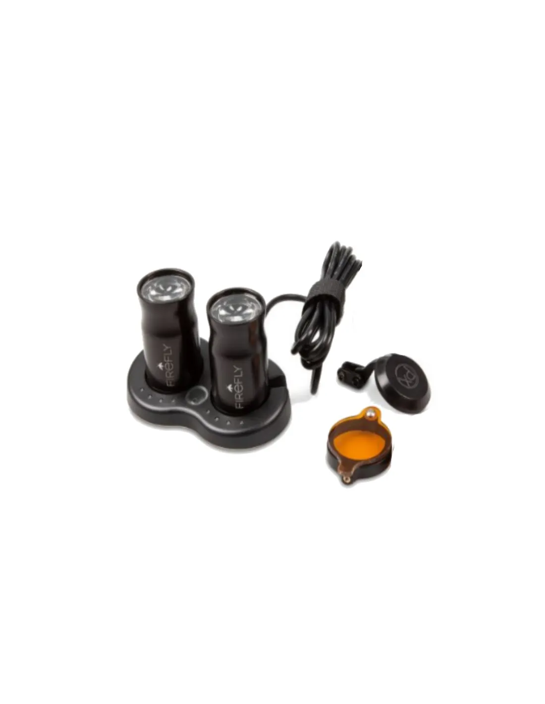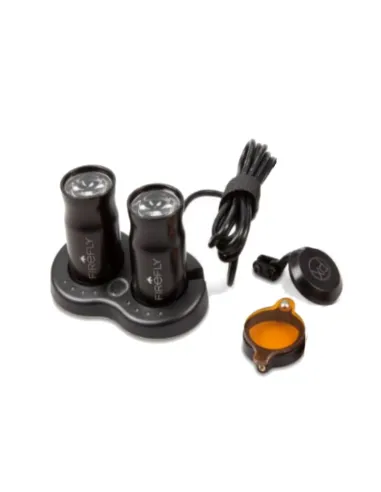 El kit de LED Firefly de PeriOptix contiene: 2 luces con batería recargable + 1 adaptador magnético + 1 estación de carga + 2 protectores color naranja para polimerizar.