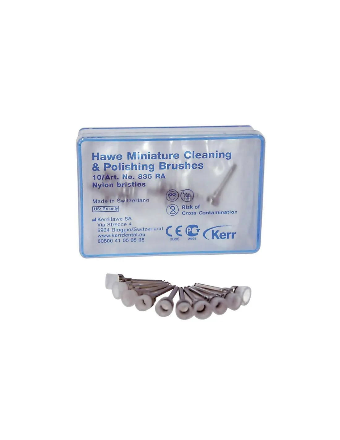 La caja de mini cepillos Nylon RA Contra-ángulo de Hawe Neos contiene 10 unidades.