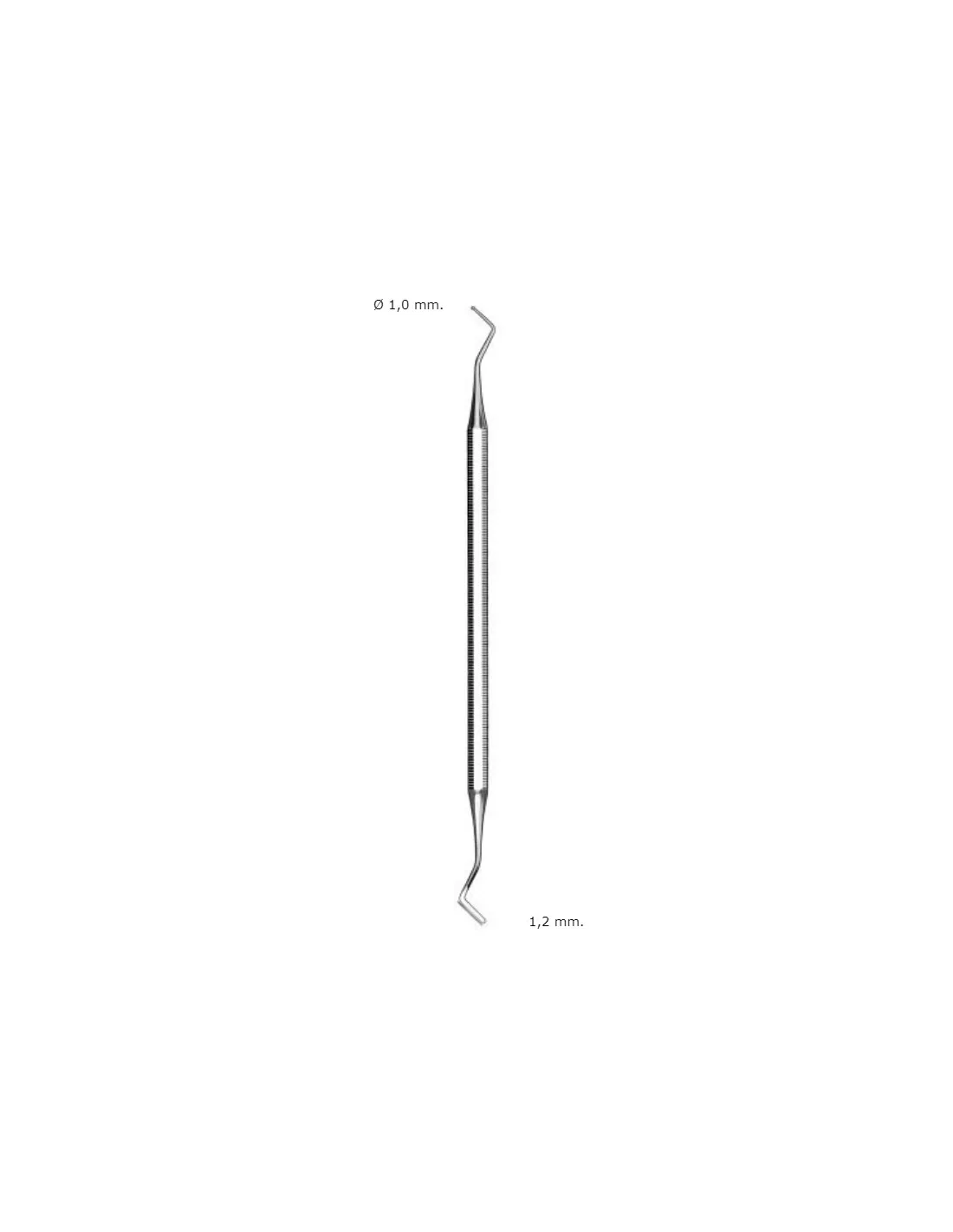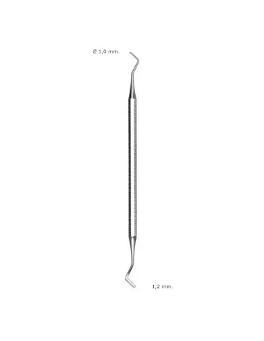 Posee doble extremo activo. Un extremo con forma de bola de 1,0 mm de diámetro y otra con forma de espátula de 1,2mm de ancho.