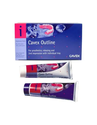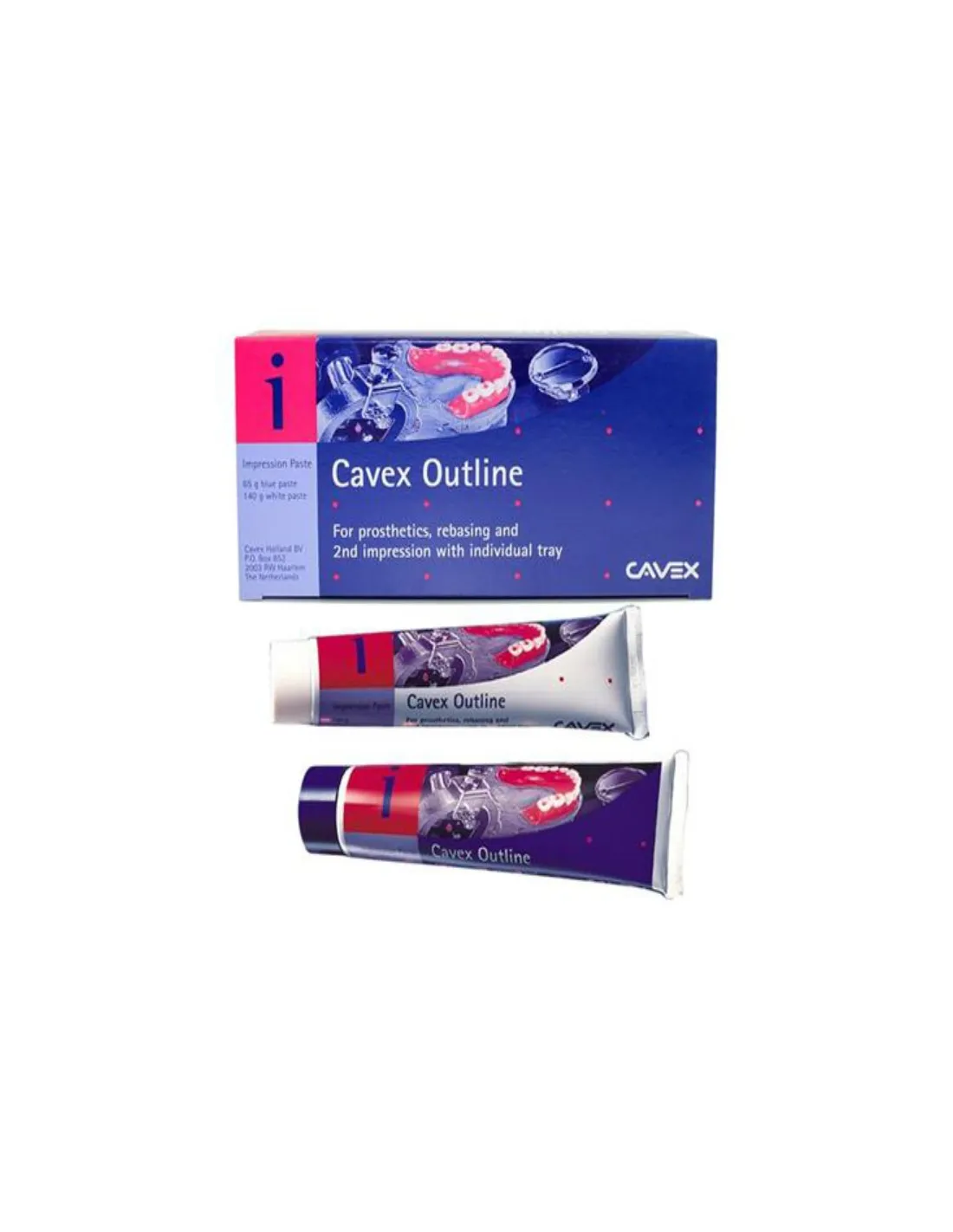 El envase de Cavex Outline Impression Paste contiene 2 tubos: 1 tubo de 65 gr. pasta azul y 1 tubo de 140 gr. pasta blanca.