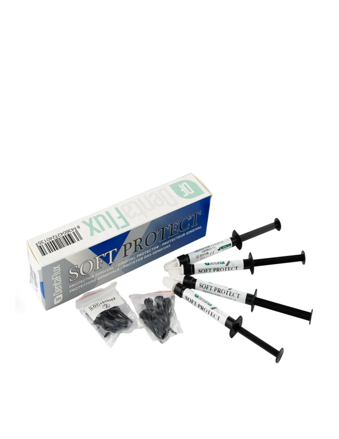 El protector gingival de Dentaflux Soft Protect es un material resinoso fotopolimerizable, especialmente, diseñado para el aislamiento de las encías durante los procesos de blanqueamiento.