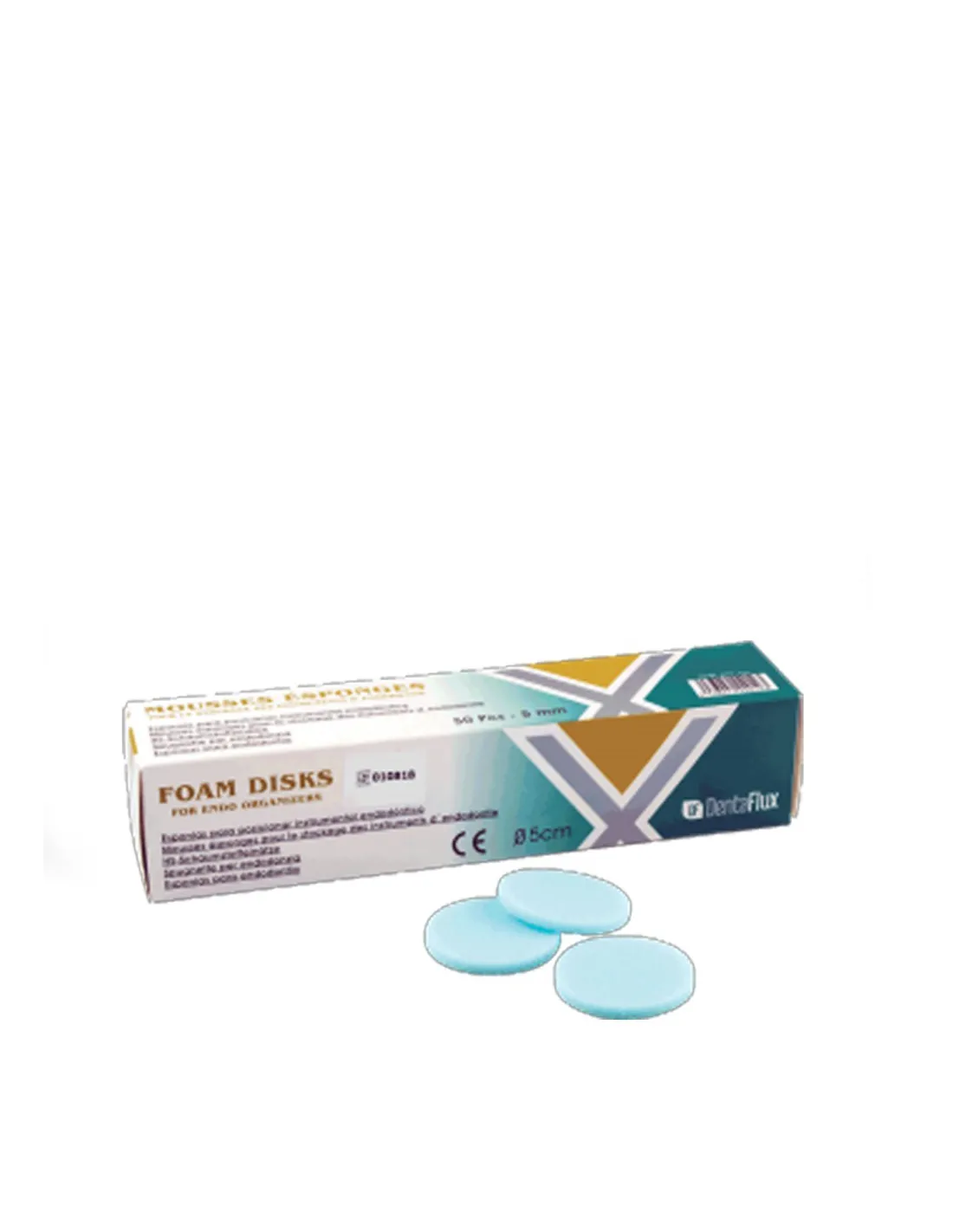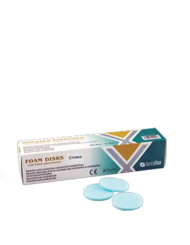 Cada caja de discos de espuma de Dentaflux contienen 50 unidades.