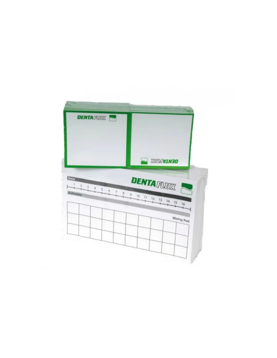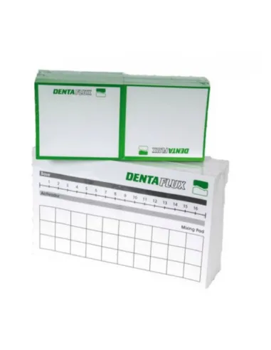Los bloques de mezcla silicona de Dentaflux son bloques de hojas de papel plastificado inherente, desechables y arrancables para mezclar a mano fácilmente materiales dentales.