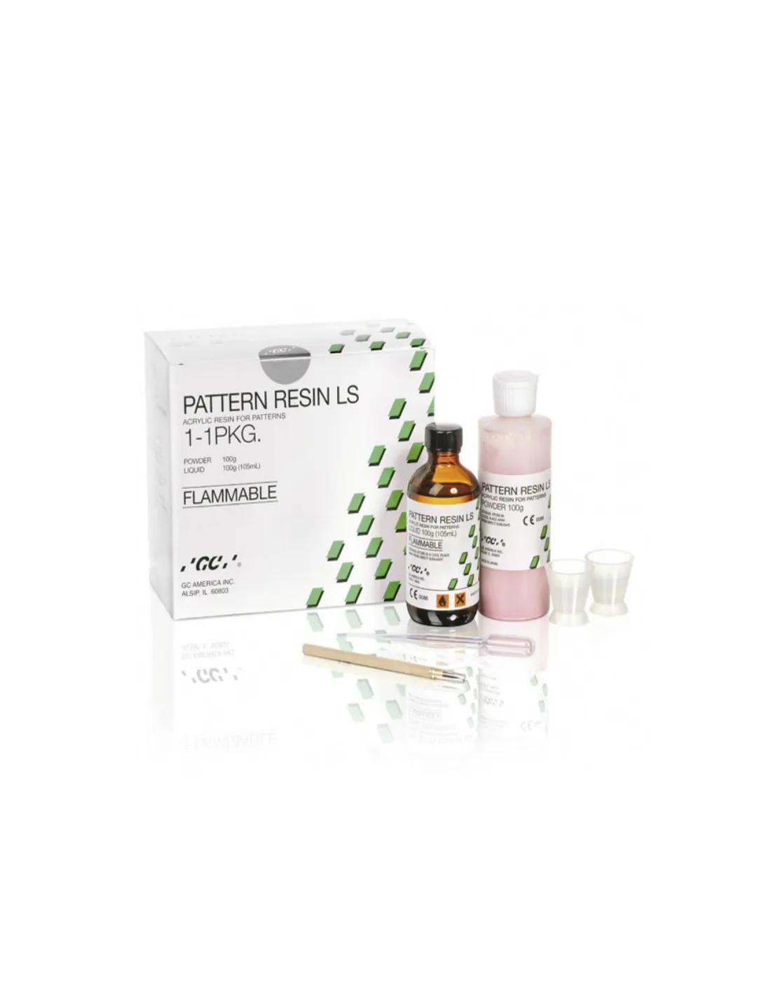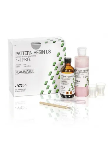 El kit de la resina acrílica Pattern Resin LS de GC incluye: Polvo 100 gr. Líquido 105 ml. Accesorios.