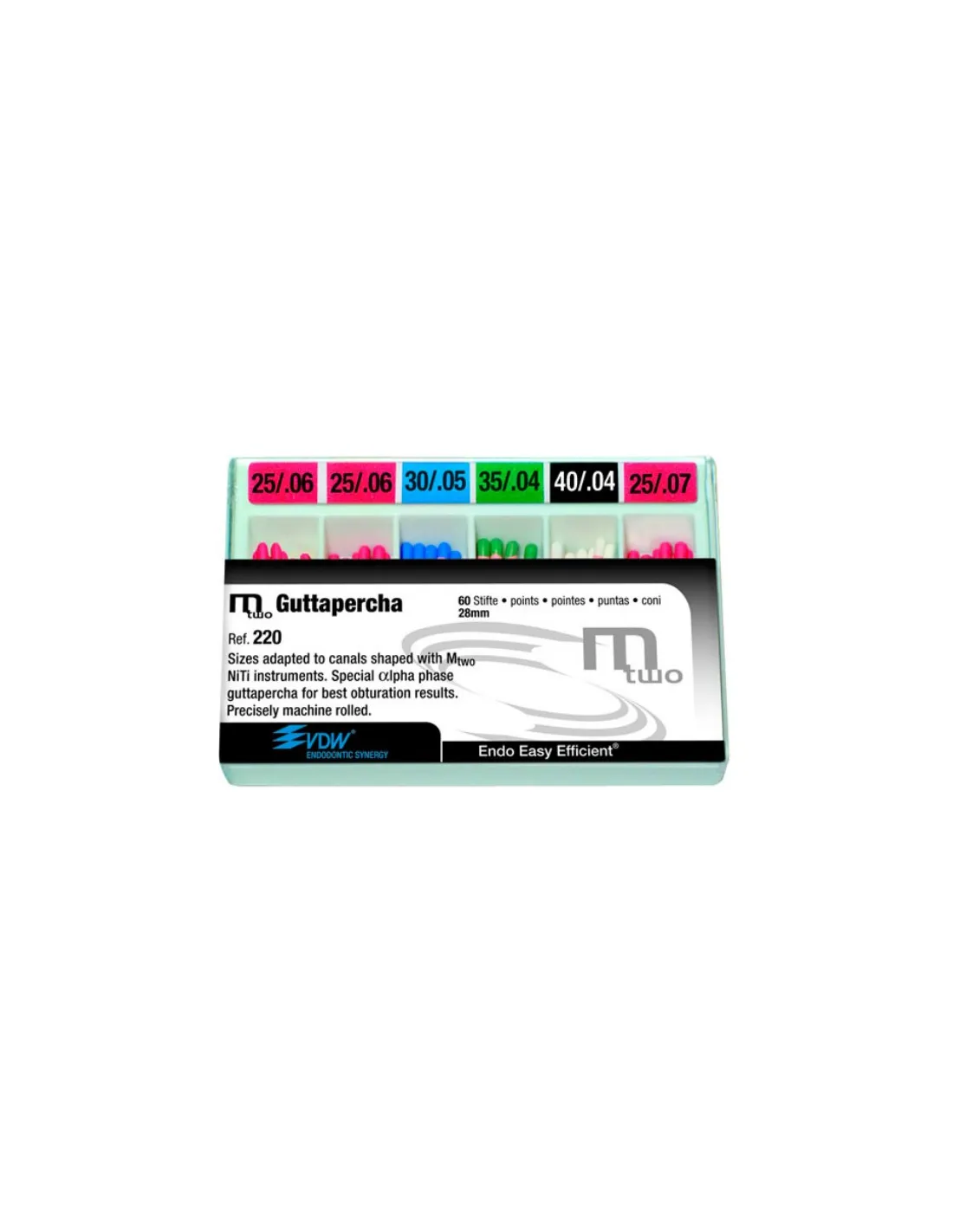 Las guta-percha Mtwo tienen conicidad .06 con una longitud de 28mm y están estandarizadas según ISO.