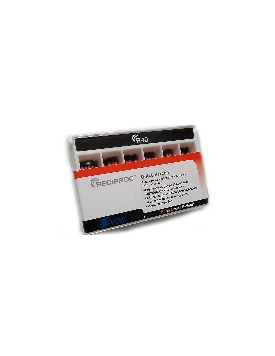La Reciproc Guttapercha R40 es una punta que tiene una longitud de 28 mm y posee un aumento regresivo del diámetro, de forma que es más estrecho en la punta que la mayoría de los instrumentos cónicos NiTi del mismo tamaño ISO.