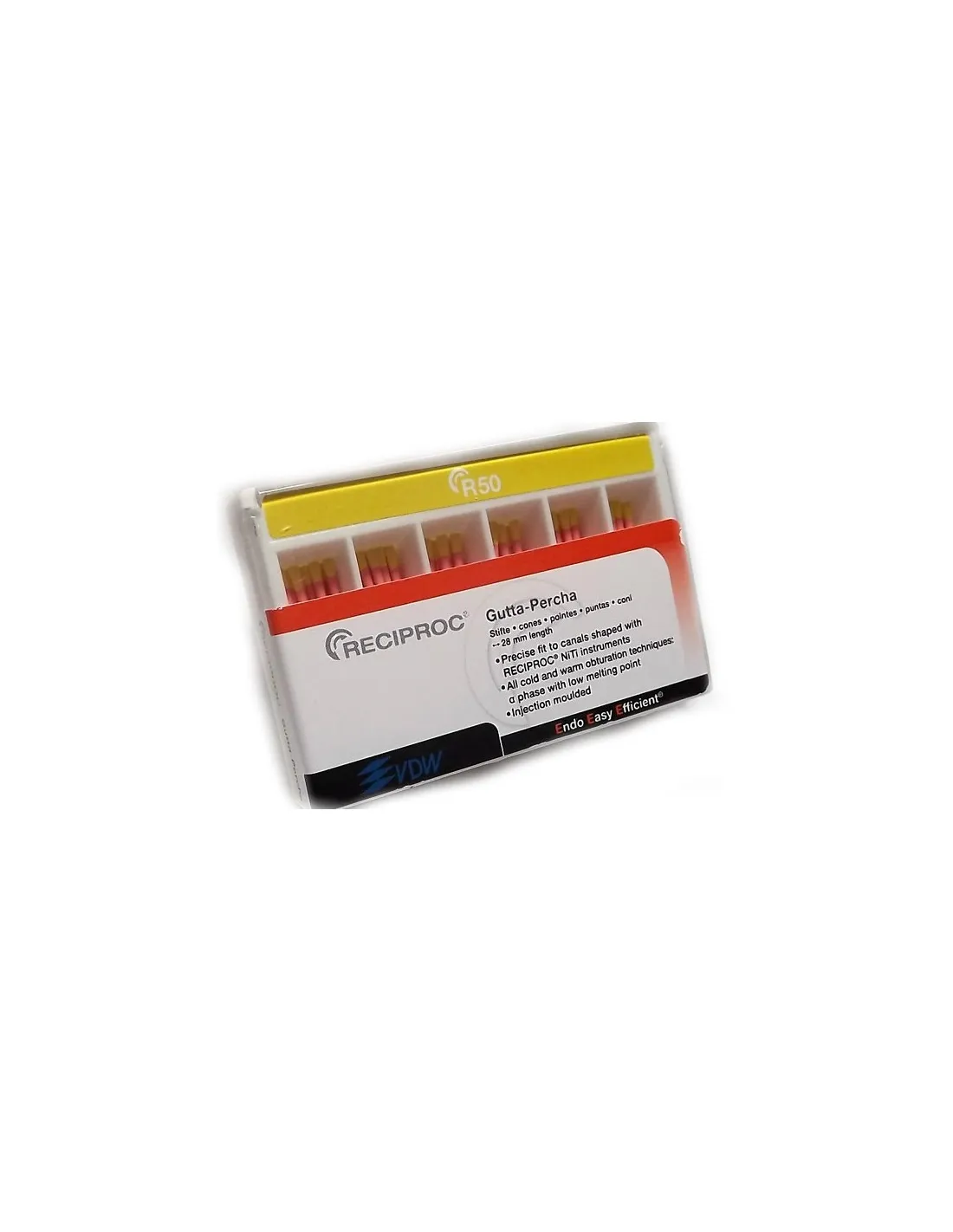 La Reciproc Guttapercha R50 es una punta que tiene una longitud de 28 mm y posee un aumento regresivo del diámetro, de forma que es más estrecho en la punta que la mayoría de los instrumentos cónicos NiTi del mismo tamaño ISO.