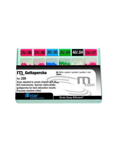 Las puntas de guttapercha Mtwo de Zipperer poseen el tamaño y la conicidad adaptada a los instrumentos rotatorios Mtwo Niti de la misma marca.