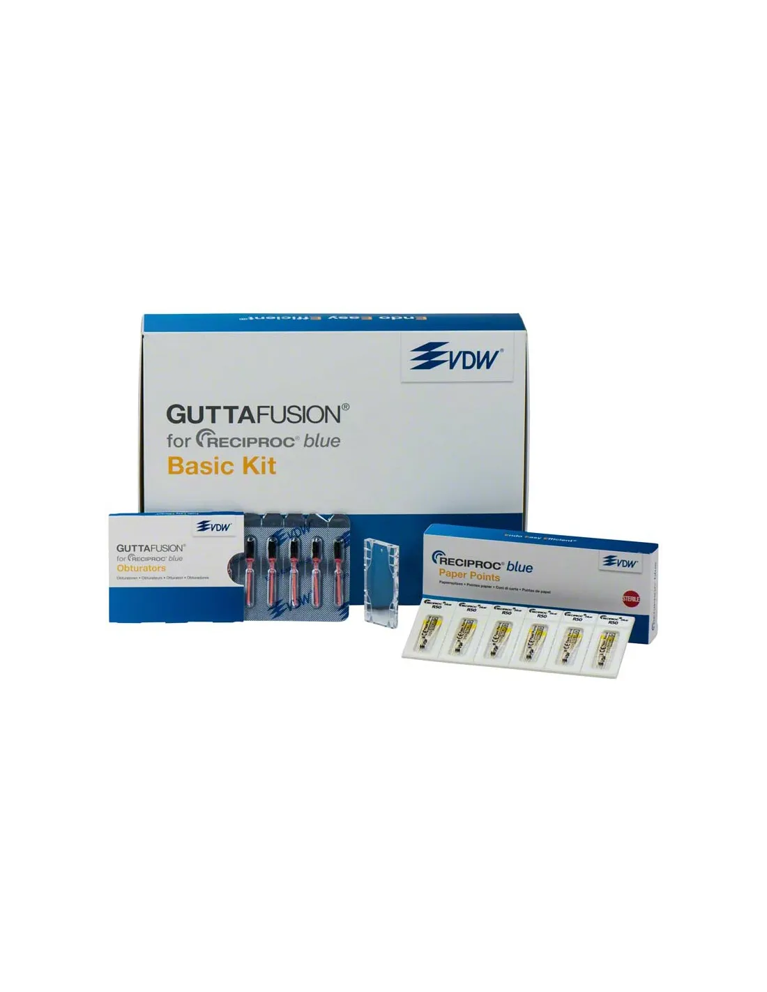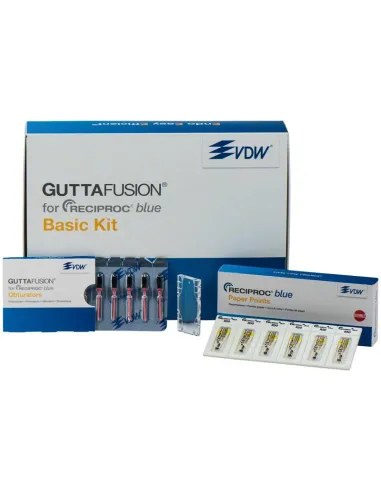 El envase de Obturadores Guttafusion Basic Kit para Reciproc Blue de Zipperer contiene: 3 blisters de 6 unidades R25 + 1 blister de 6 unidades R40 + 1 blister de 6 unidades R50 + Block de practica de obturación para GUTTAFUSION + Surtido de Puntas de papel Reciproc esterilizadas R25, R40 y R50