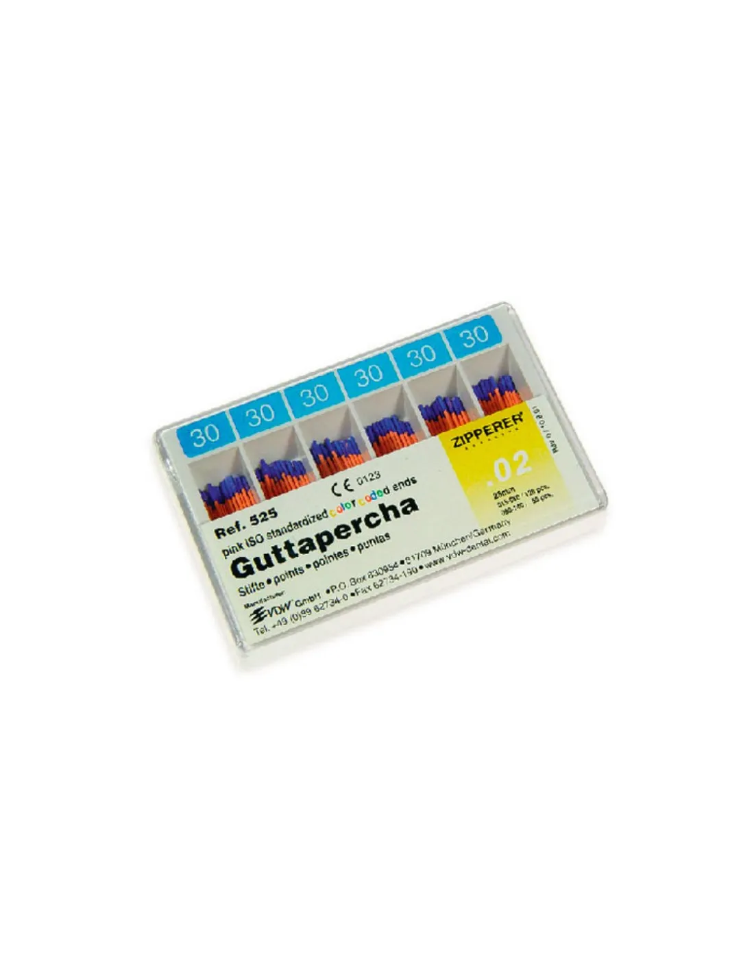 La caja de Puntas de Gutapercha Estandarizadas ISO de Zipperer contiene 120 unidades, a elegir tamaño entre los disponibles.