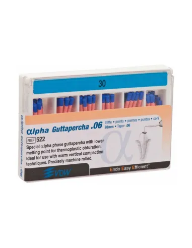 Las puntas de guttapercha Alpha de Zipperer están indicadas para la obturación termoplástica, por su bajo punto de fusión.