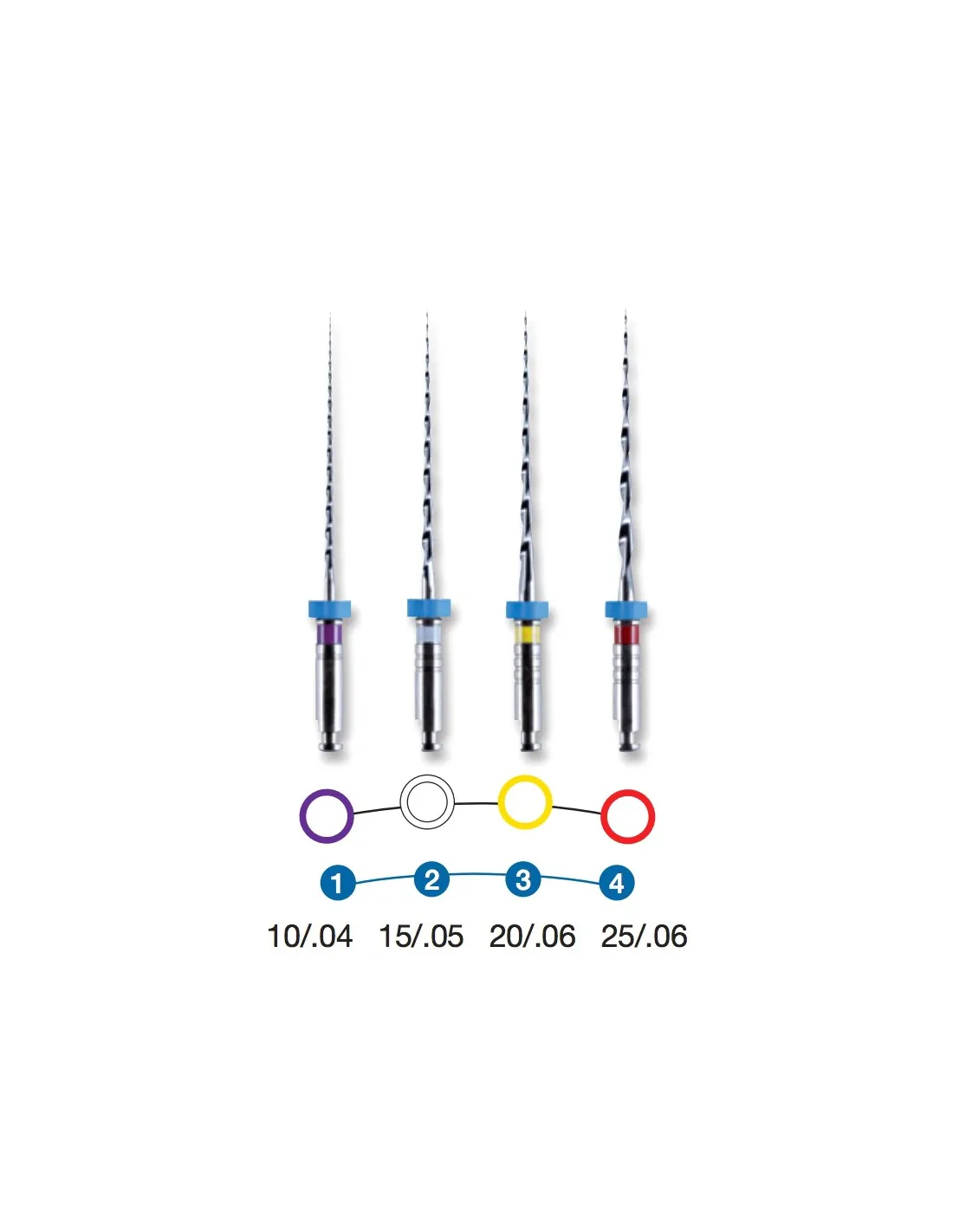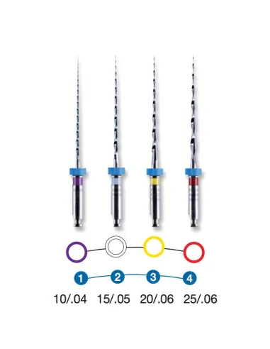 Gracias a estos instrumentos (10/.04 - 15/.05 - 20/.06 - 25/.06) no hay pérdida innecesaria de materia dental, ya que eliminan unicamente lo que es necesario.
