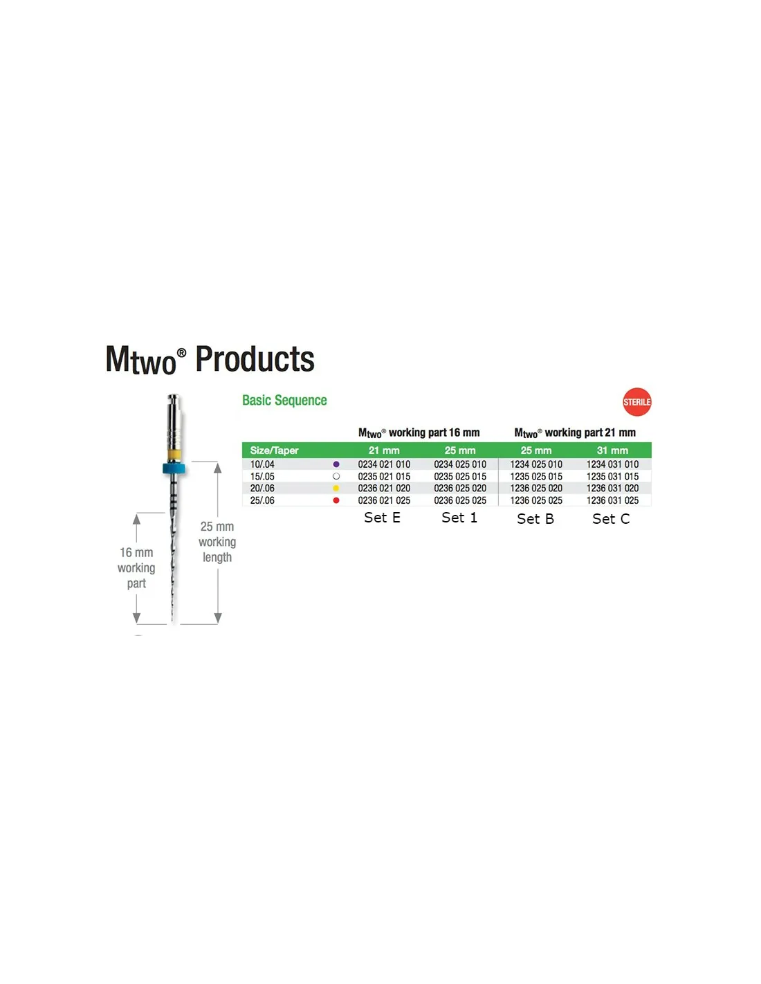 Cada set de limas MTWO Secuencia Básica contienen el siguiente surtido de tamaños y conicidades: 10/.04 - 15/.05 - 20/.06 - 25/.06