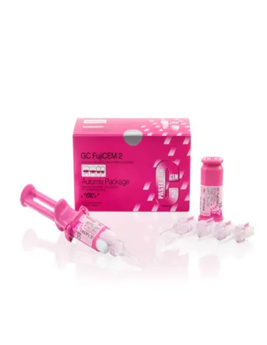 FujiCEM 2 de GC es un cemento de fijación de ionómero de vidrio modificado con resina formato pasta-pasta.