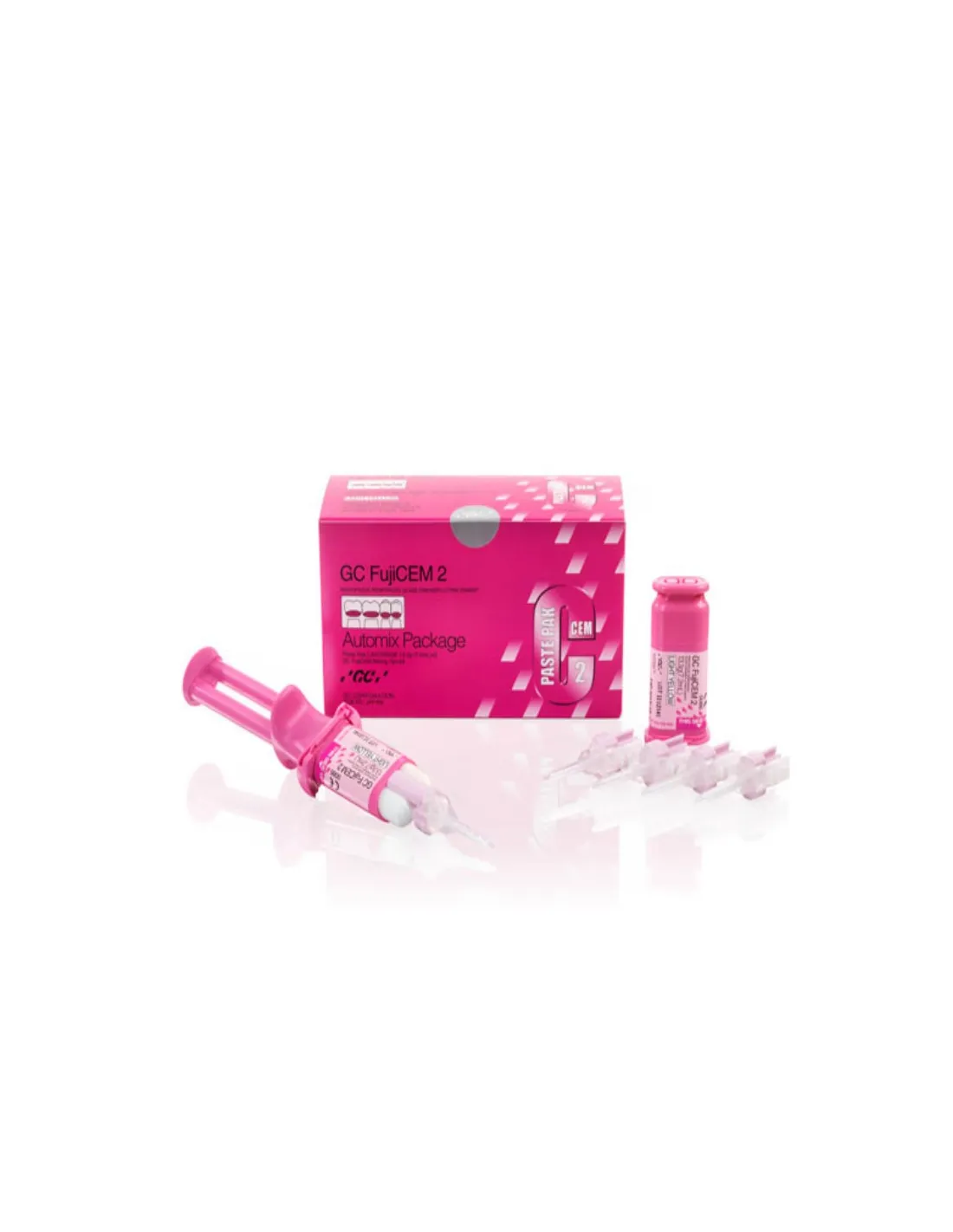 El envase del cemento de fijación FujiCEM 2 Automix Reposición de GC contiene 2 cartuchos paste pak 13,3gr.