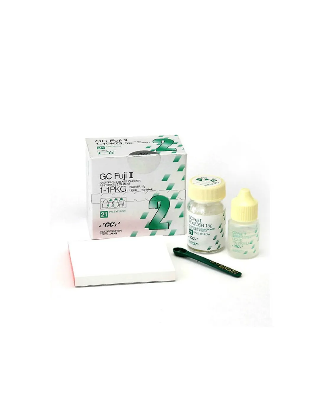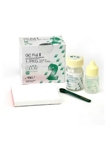 Fuji II 1-1 PKG de GC es un material restaurador en 2 componentes polvo y líquido para mezclar y formar un cemento restaurador de ionómero de vidrio radiopaco, autopolimerizable y de baja solubilidad.