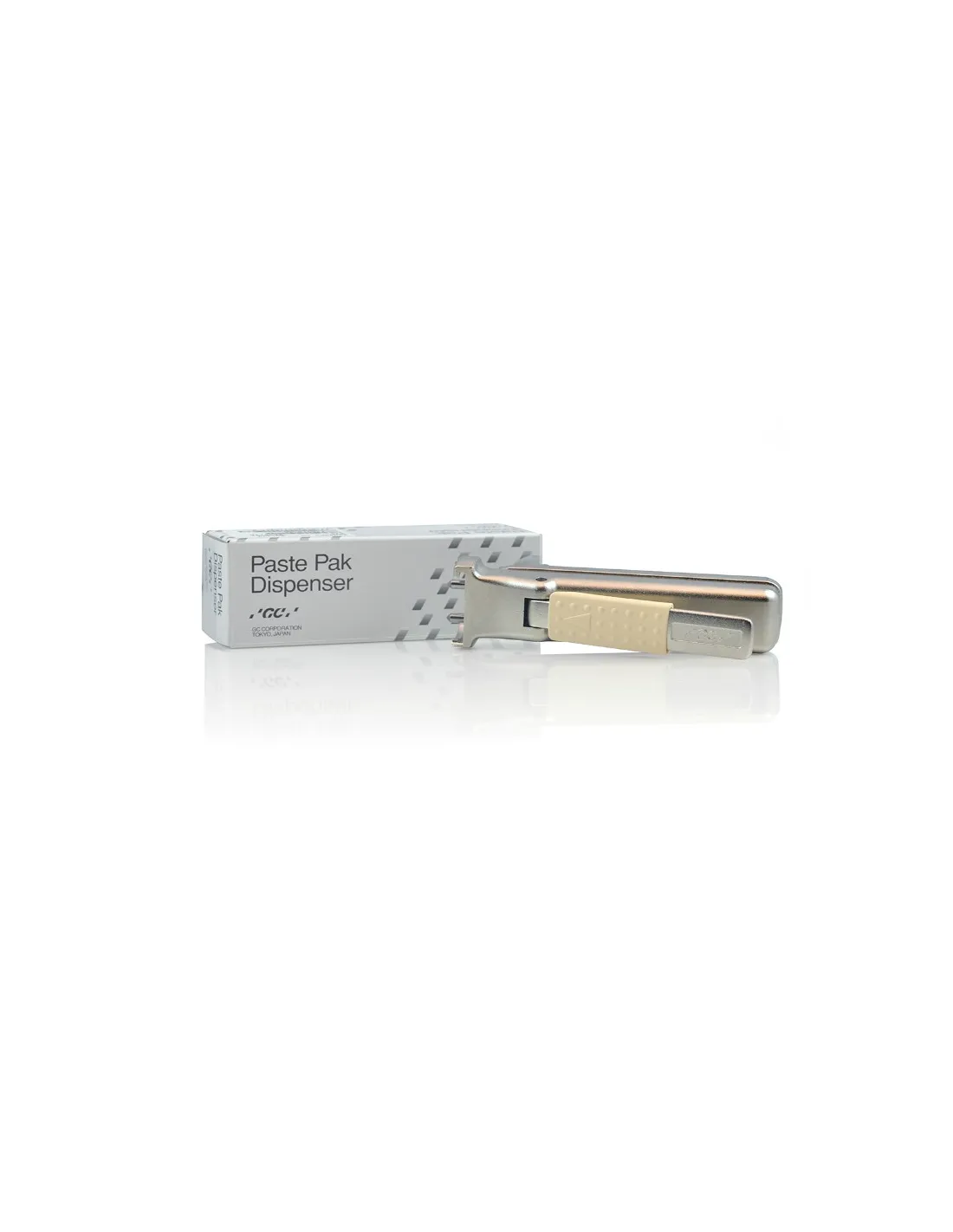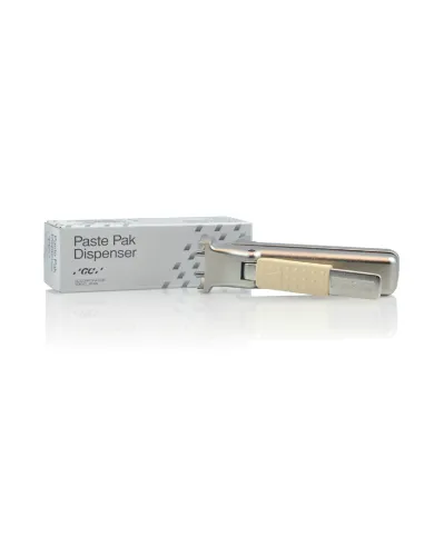 El dispensador metálico paste pak de GC está indicado para su uso con cartuchos paste pak en cementos tipo pasta-pasta.