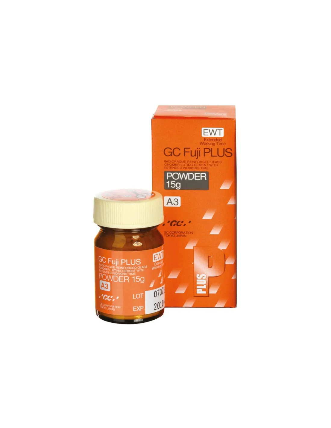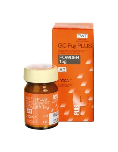 El envase de Fuji Plus EWT Polvo Reposición de de GC contiene: 1 bote de 15gr polvo para mezclar, tono A3.