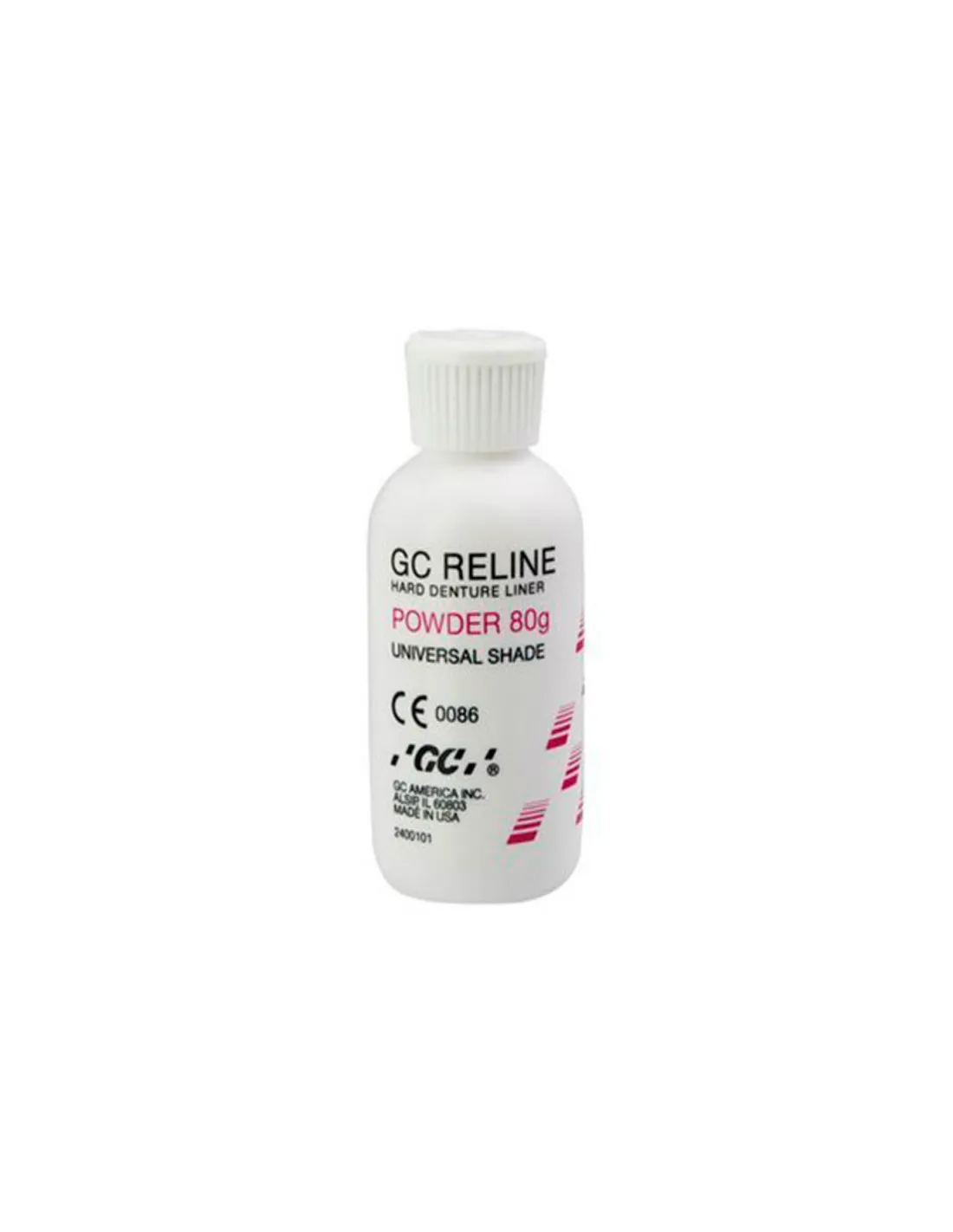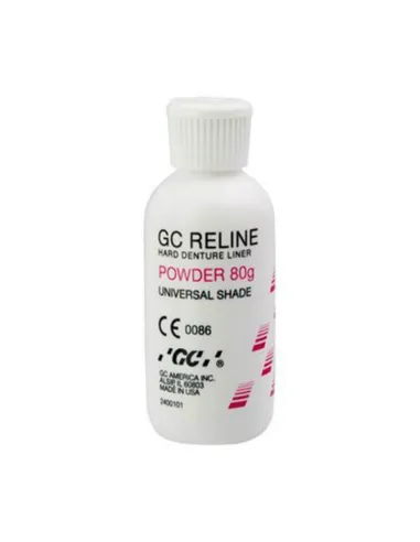 Reline Polvo de GC es un material para mezclar y formar resina acrílica, sin metilmetacrilato (MMA). Indicada para rebases duros, directamente en boca, de prótesis completas o parciales, de larga duración, removibles en clínica.