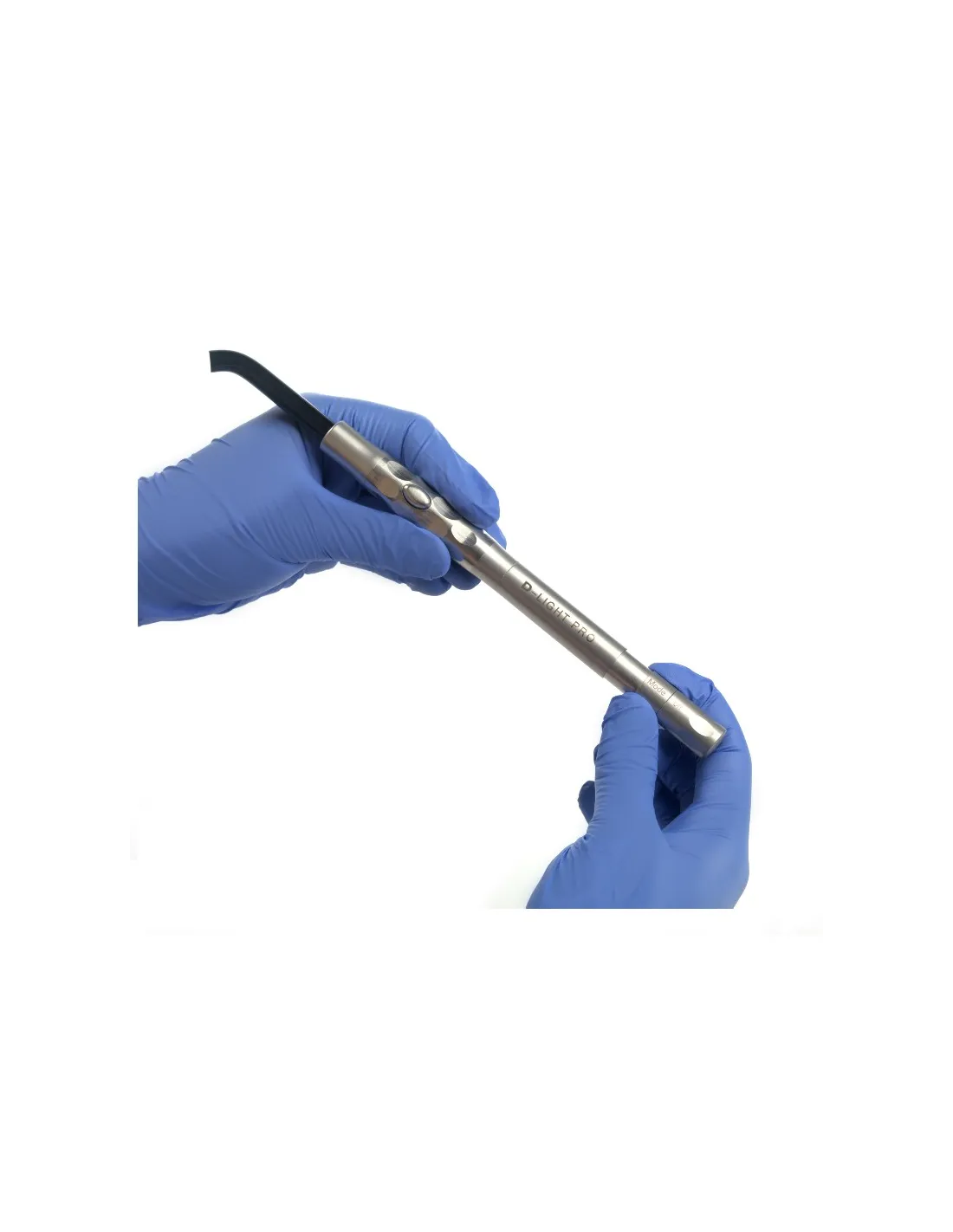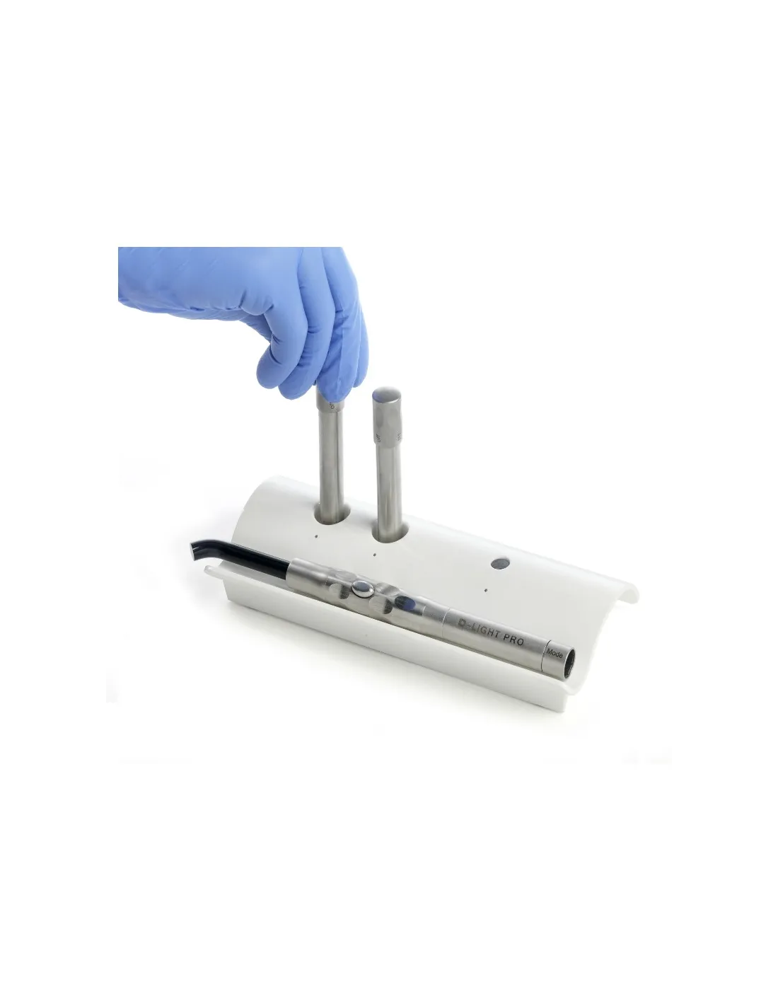 El kit D-Light Pro de GC contiene: 1 pieza de mano (mango y módulo electrónico) + guía de luz de alta resistencia 8 mm + pack de baterías (x 2) + estación de carga + fuente de alimentación + adaptadores EU/UK + protector de ojos duro y blando (x 3).