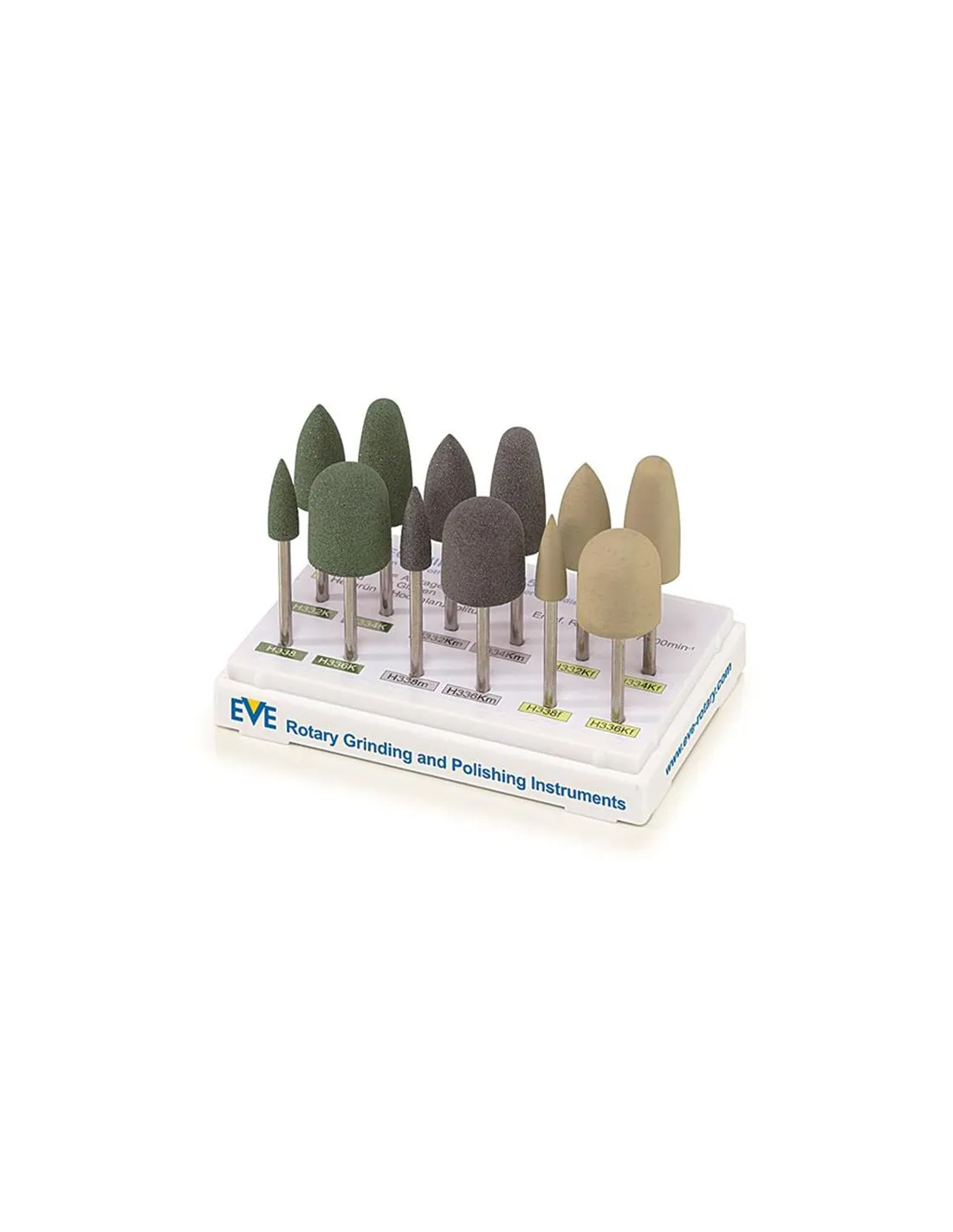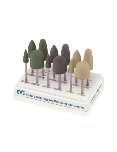El Kit de pulidores de resina de EVE es un completo sistema de acabado y pulido para laboratorio, con 12 pulidores de 4 formas diferentes: mini llama, punta, llama y granada.