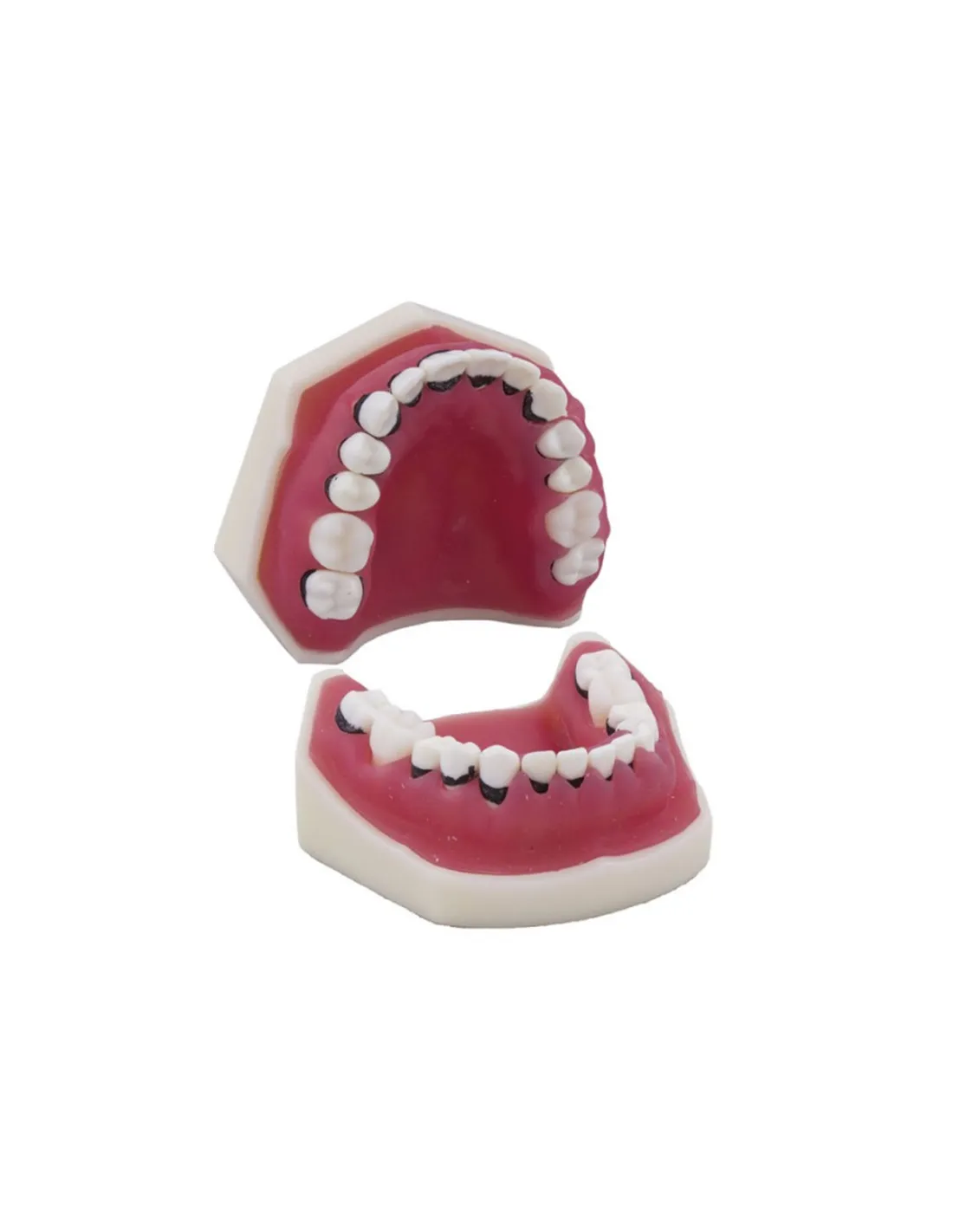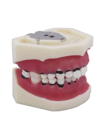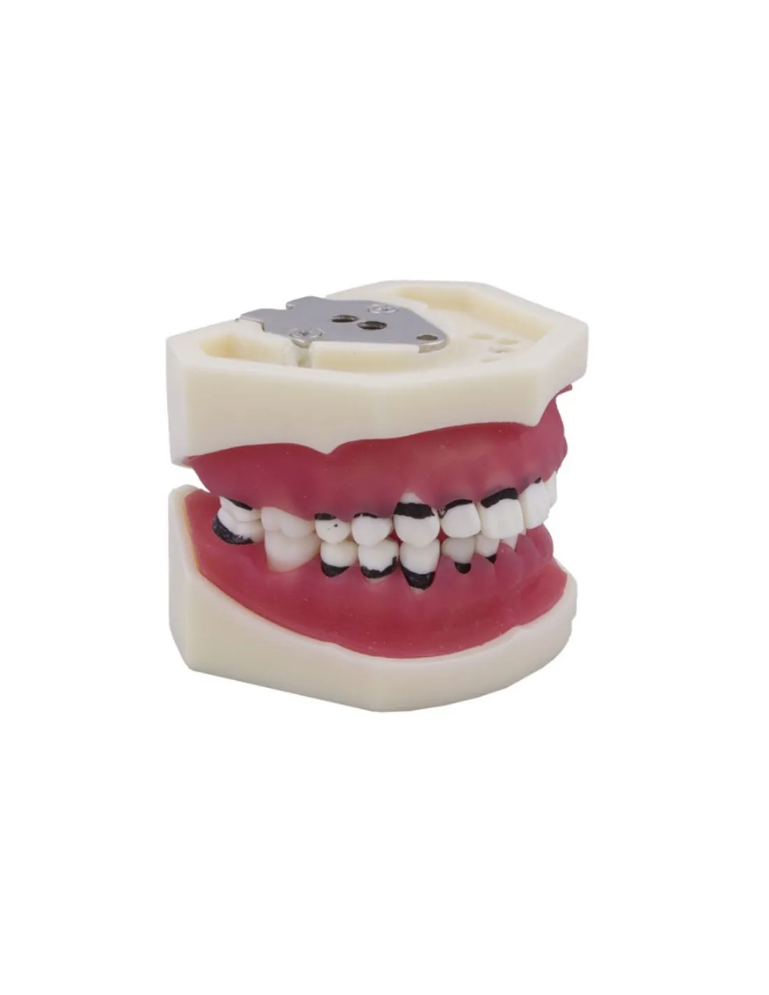 Muy útil para realizar prácticas. Además es una excelente simulación de periodontitis en fase avanzada, encía inflamada con recesión y abrasión dental por cepillado en el cuadrante derecho que enseña vista de cálculos dentales. Dientes enraizados anatómicamente con cálculos. Explica los cálculos subgingivales.