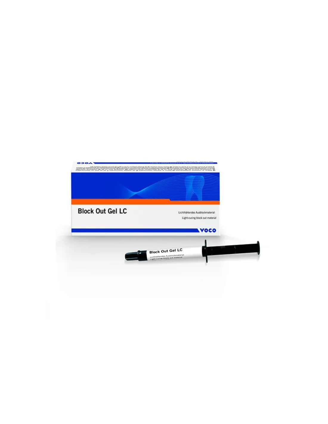 La caja de Block Out Gel LC material de bloqueo de Voco contiene 4 jeringas de 1,2 ml + accesorios.