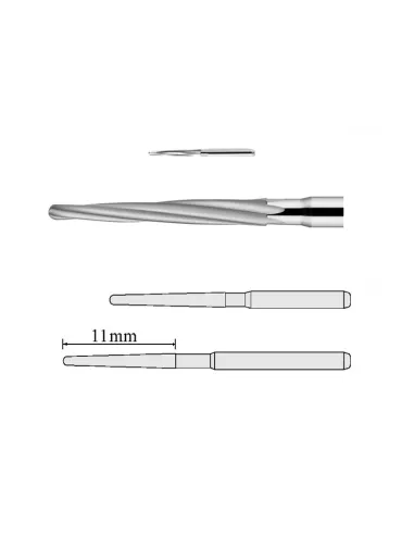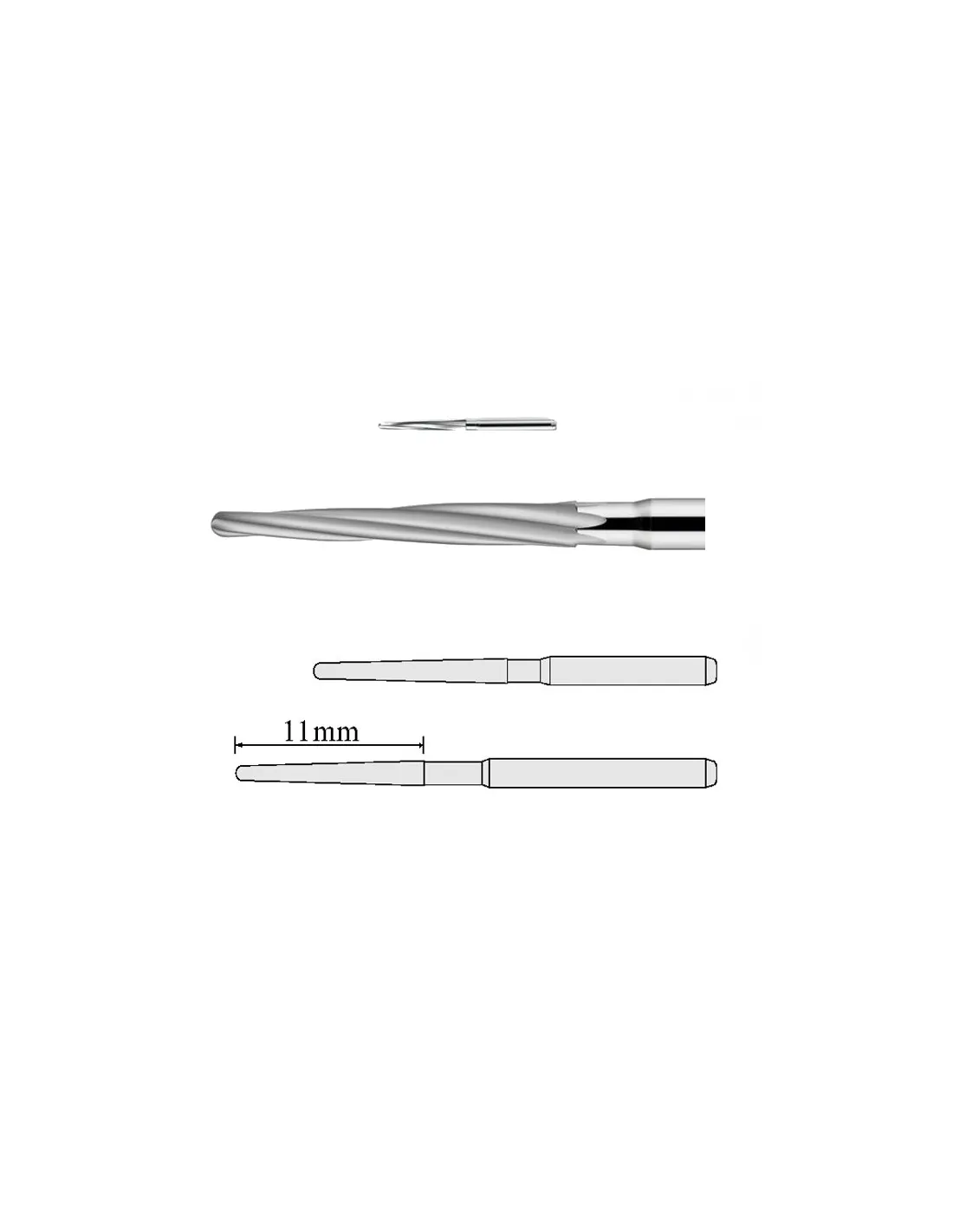 Fresa de corte lateral, punta de corte hemisférica y parte activa de 11mm. Gracias a sus 6 hojas helicoidales, no produce vibraciones.