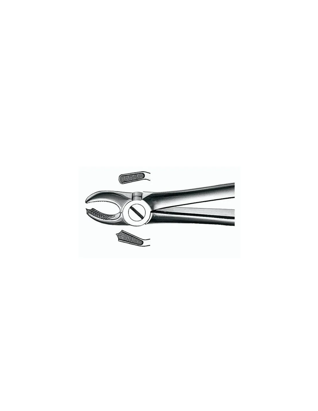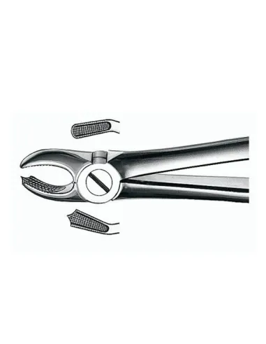 Este forceps tiene una valva con contorno redondeado y la opuesta lo tiene en pico, para poder penetrar entre las raíces vestibulares.