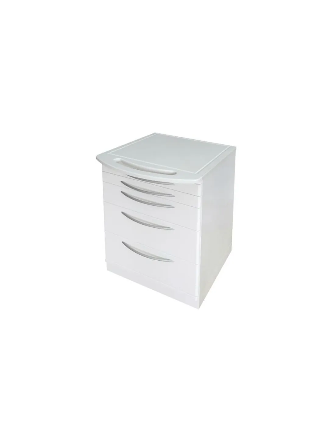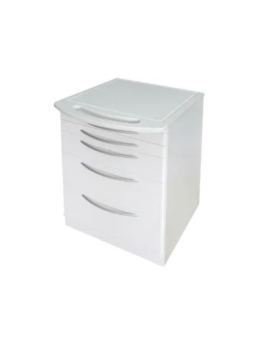 Módulo rodante para clínica de Zilfor con 5 cajones y encimera blanca con asa ovalada.